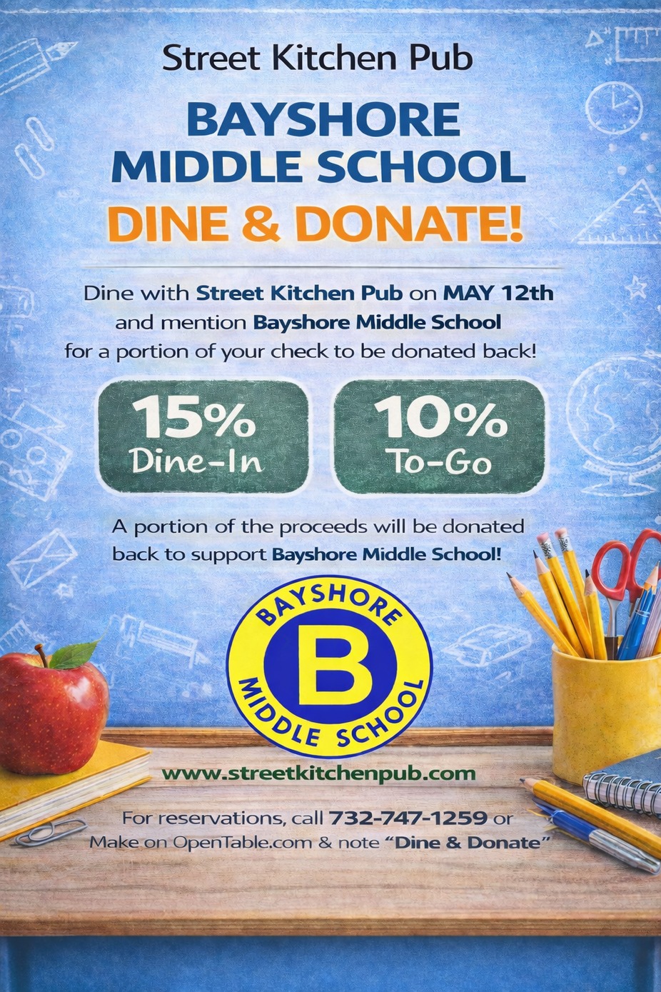 Dine with Street Kitchen Pub and mention “BAYSHORE” for a portion of your check to be donated back to the Bayshore Middle School PTO!
