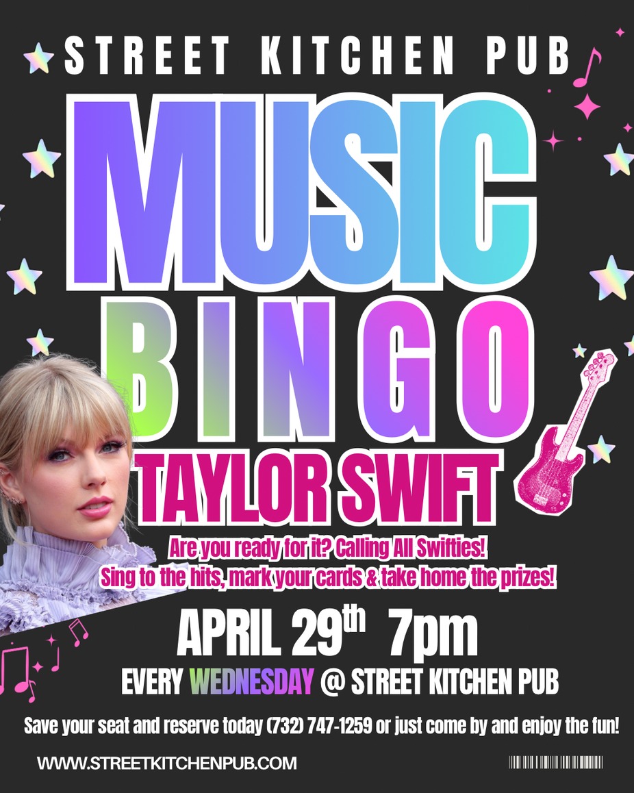 Taylor Swift Music Bingo @ 7pm. To reserve your seats call 732-747-1259 or make on OpenTable.com and note “Music Bingo”