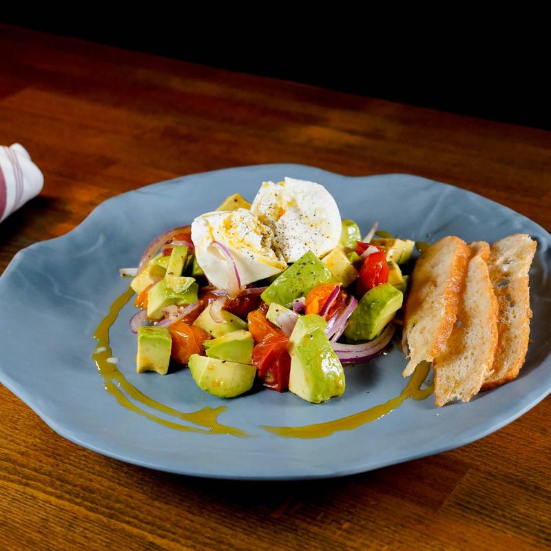 Burrata cheese, mango purée, tomato, red onion, avocado & tossed in olive oil.