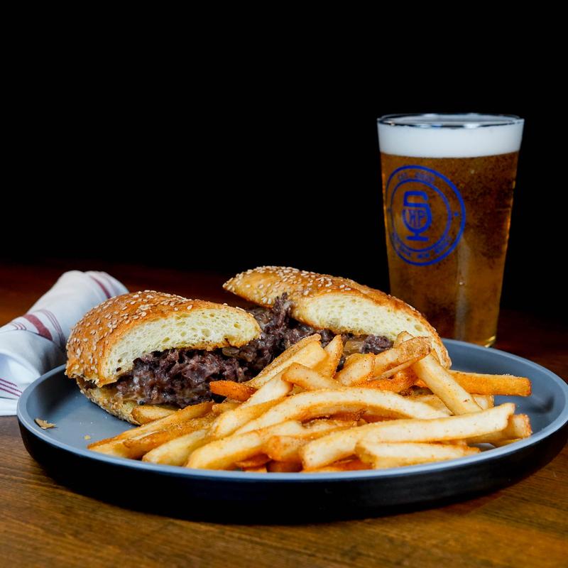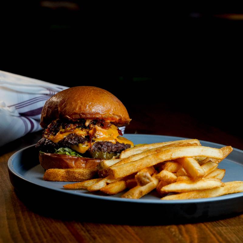 Two 4oz. Angus beef patties, American cheese, bacon jam, shredded lettuce, pickles, house sauce, served with fries.