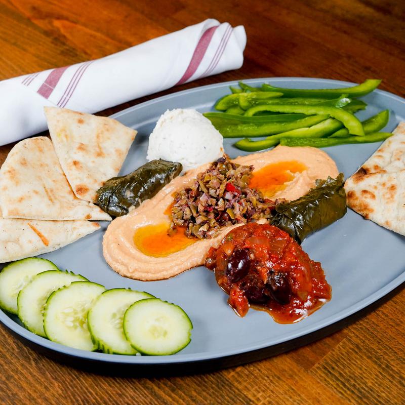 Piquillo pepper hummus, olive tapenade, bell peppers, cucumbers, eggplant, caponata, whipped honey feta, stuffed grape leaves with toasted pita.
