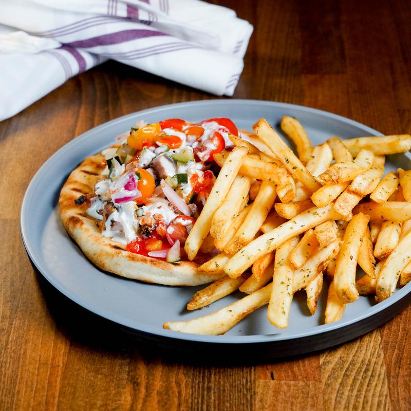 Homemade tzatziki, tomato, cucumber and red onion served with Greek fries.