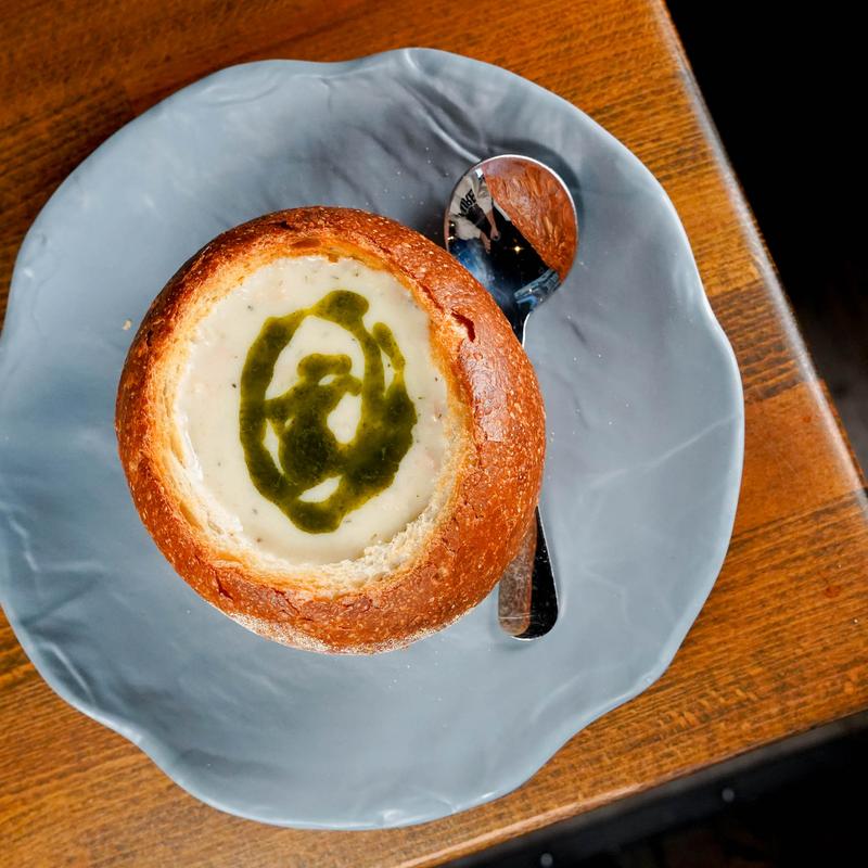 Homemade New England clam chowder served in a warm hollowed out bread bowl