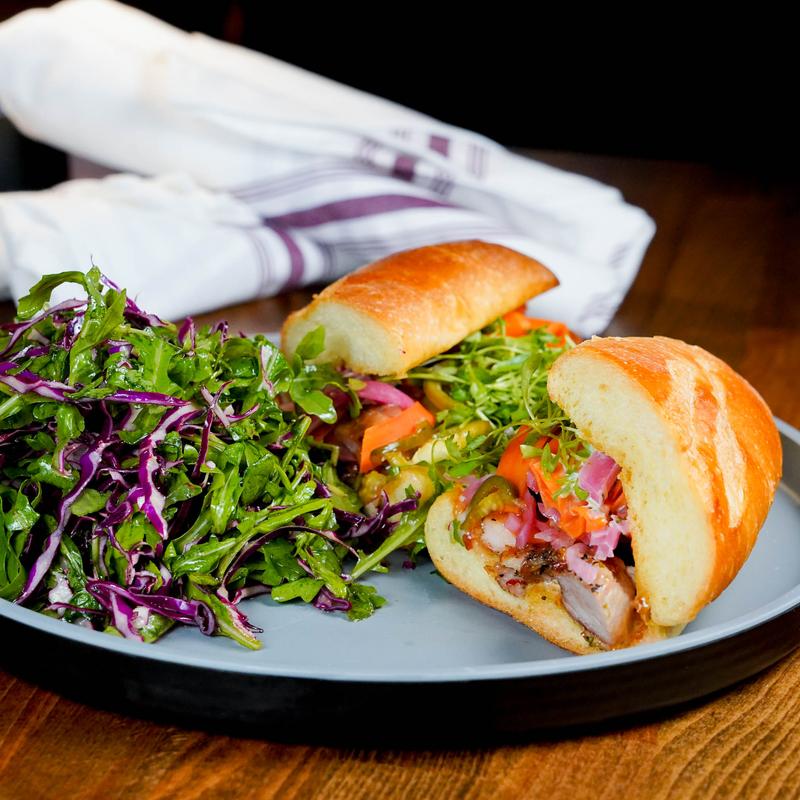 Sweet chili marinated chicken thigh, garlic cilantro aioli, pickled carrots, red onions, cilantro, arugula & cabbage salad.