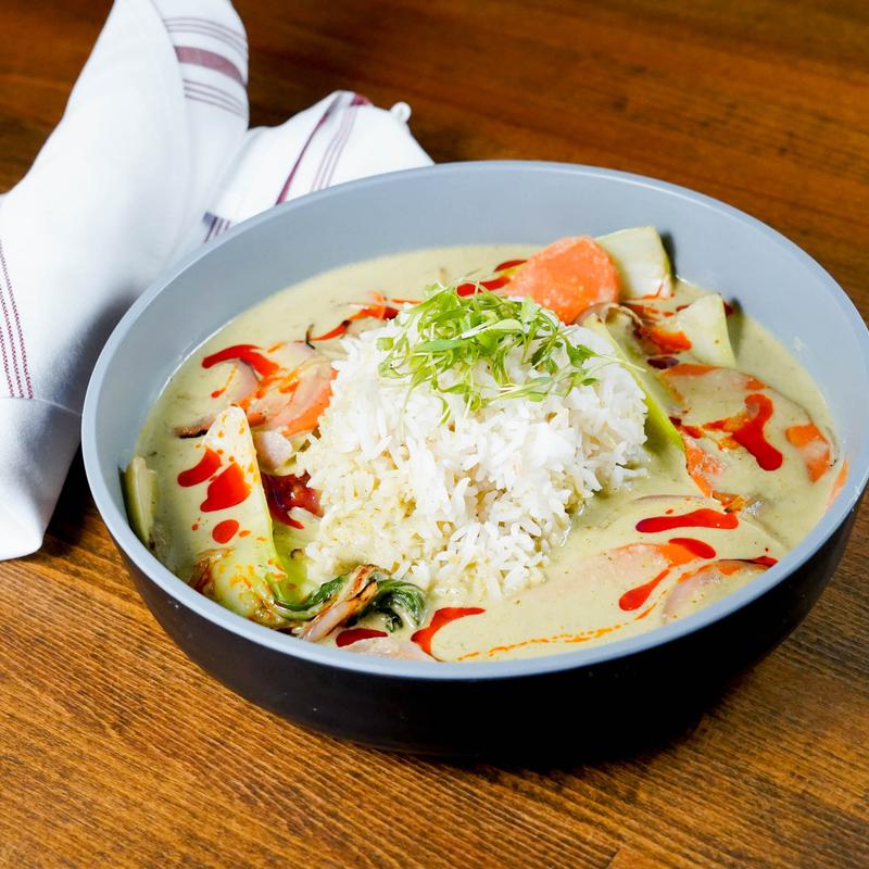 Coconut green curry with carrots, bok choy, red onion, micro cilantro & chili crisp oil.