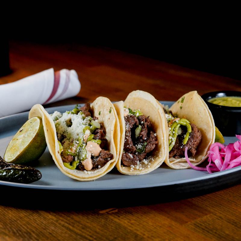 3 Carne asada tacos served with guacamole, chipotle crema, diced onions, cilantro and cotija cheese.